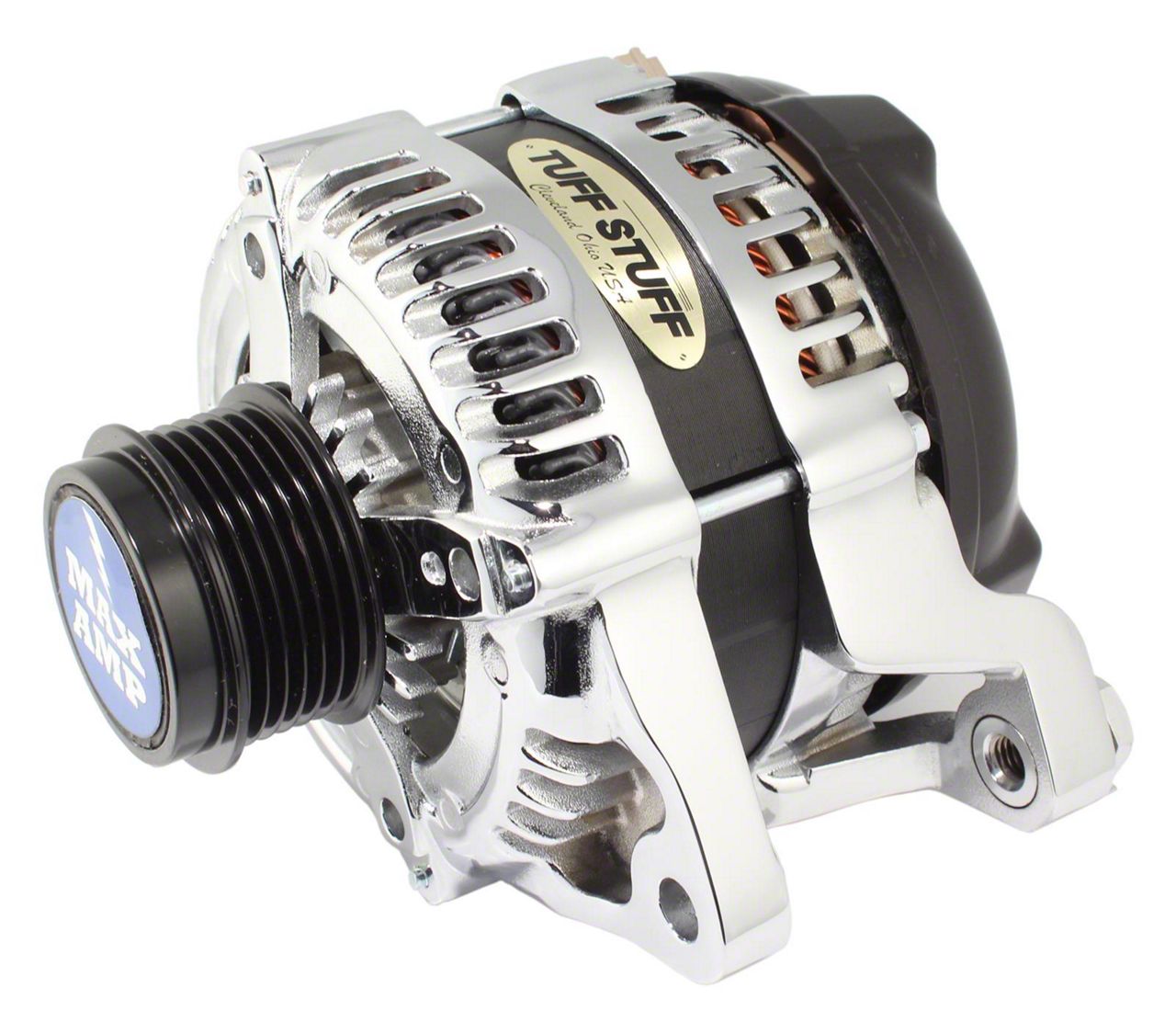 High Output. Built for the Mustang GT and V6, this Tuff Stuff Performance Alternator comes in a polished chrome finish and includes a 6-groove pulley. Made for 12 Volt and negative ground applications, this alternator has a high output of 175 amperes and is made from entirely new components.