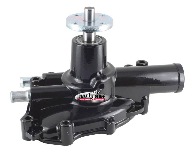 Construction and Appearance. Crafted from lightweight aluminum casting, this water pump offers superior heat dissipation and is 50% lighter than traditional cast iron pumps. It features a stealth black powder coat finish that combines durability with a sleek, professional look.