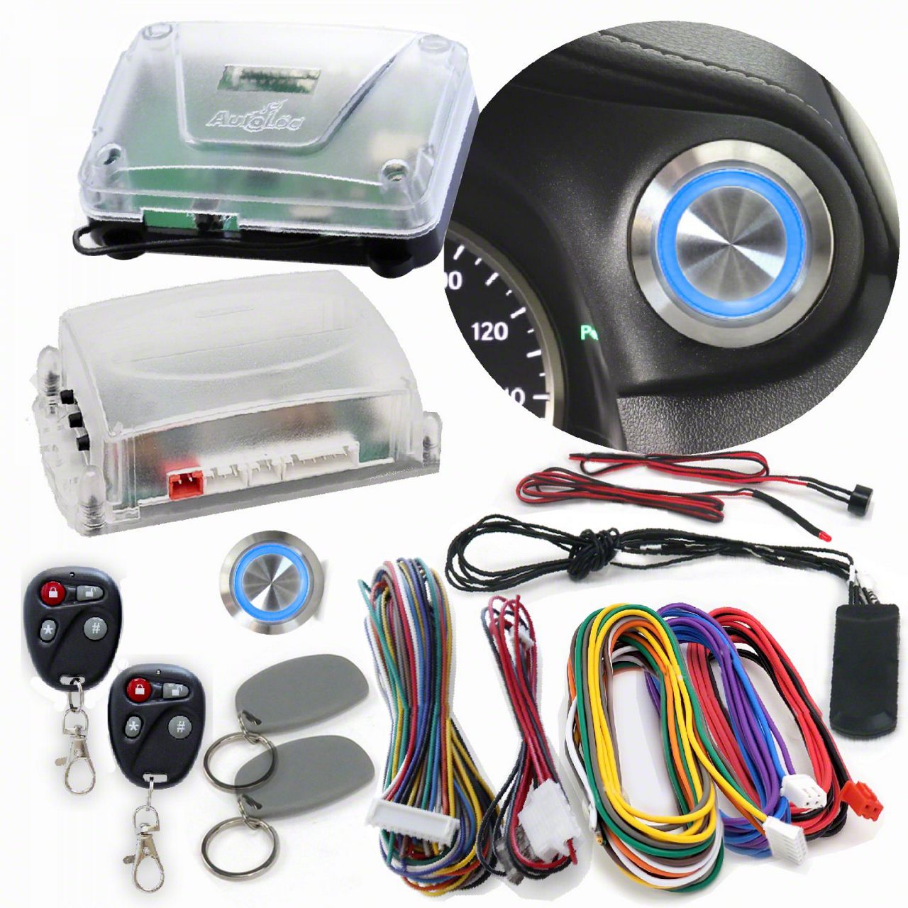 Innovative Engine Start System. The Billet Push Button Engine Start/Stop with Keyless Entry, Remote Start, and RFID Kit provides a modern solution to replace traditional keyed ignitions. It enhances driver convenience by enabling remote engine start, keyless entry, and push button ignition control via remotes or a smartphone app, streamlining vehicle operation with advanced technology.