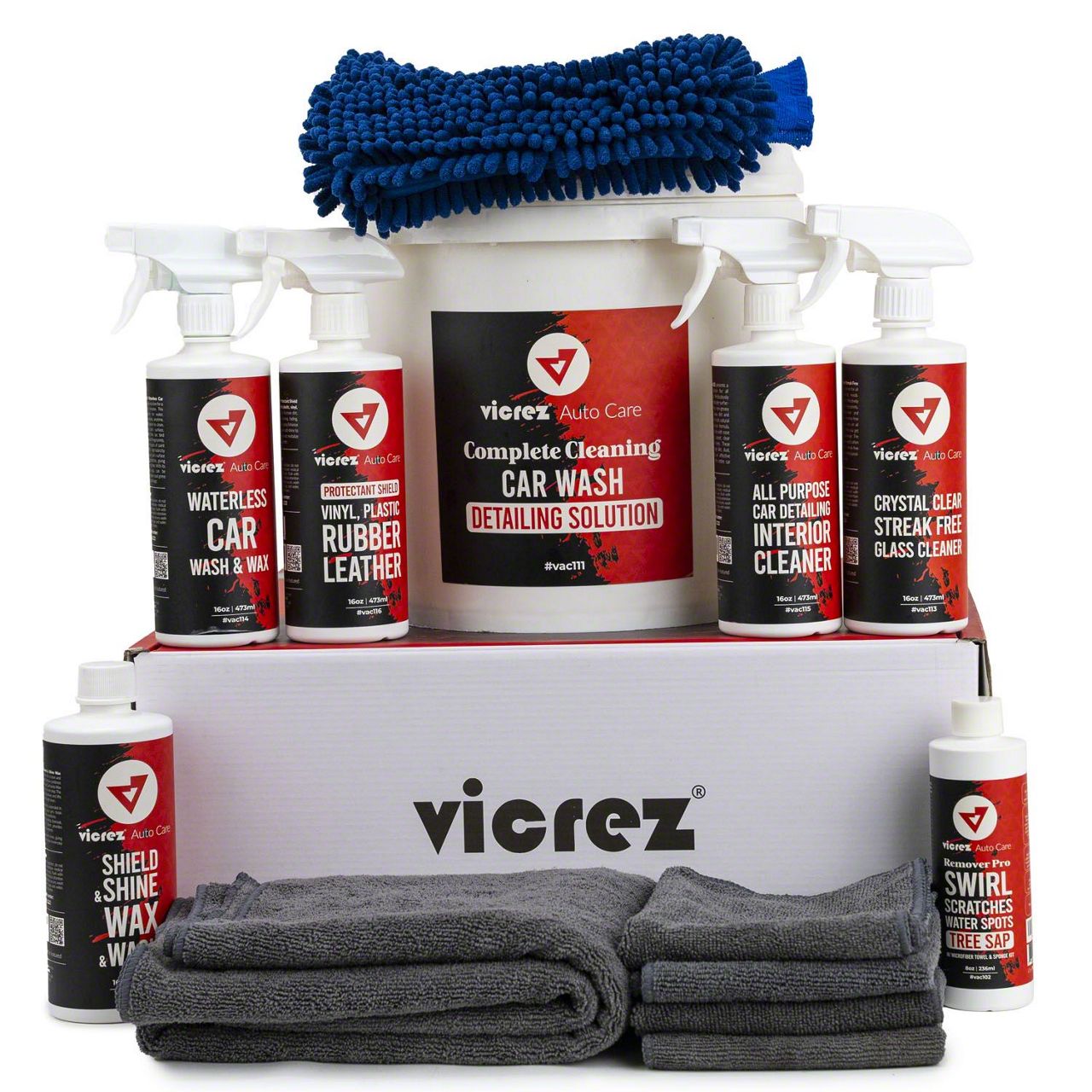Upgrade your car washing routine with the Vicrez Auto Care vac111 Complete Cleaning Car Wash Detailing Solution 13-Piece Kit. This professional-grade kit is the secret weapon for achieving a scratch-free shine every time. Say goodbye to using just one bucket, dish soap, and old beach towels. Improper washing and drying can lead to swirl marks and scratches, but this kit will help you avoid those common mistakes.Directions:1. Start by rinsing your car thoroughly with a hose or pressure washer to remove loose dirt and debris.2. Fill a bucket with water and add the appropriate amount of the included car shampoo. Agitate the solution with a wash mitt or sponge to create a thick lather.3. Starting at the top of the car, wash one section at a time using the mitt or sponge, being sure to rinse the mitt or sponge frequently to prevent scratching.4. Once the entire car has been washed, rinse it thoroughly with a hose or pressure washer.5. Use the included microfiber towels to dry the car, being sure to wring out the towels frequently to prevent scratching.6. Use the included tire and wheel cleaner, tire shine and tire protectant, wheel cleaner and wheel protectant to clean and protect the wheels, tires and the other exterior parts of the car.7. Finish by applying the included wax or sealant to add a layer of protection and shine to the car's paint.Note:Always follow the instructions on the individual products in the kit for best results. The 13-piece kit is designed to clean, shine, and protect your car's finish, as well as restore faded trims both interior and exterior. It effectively breaks down stuck-on dirt, grease, and grime, keeping your plastic looking modern and new. Effortlessly add gobs of deep gloss and keep your car looking brand new. Perfect for first-timers, hardcore enthusiasts, and professional detailers.