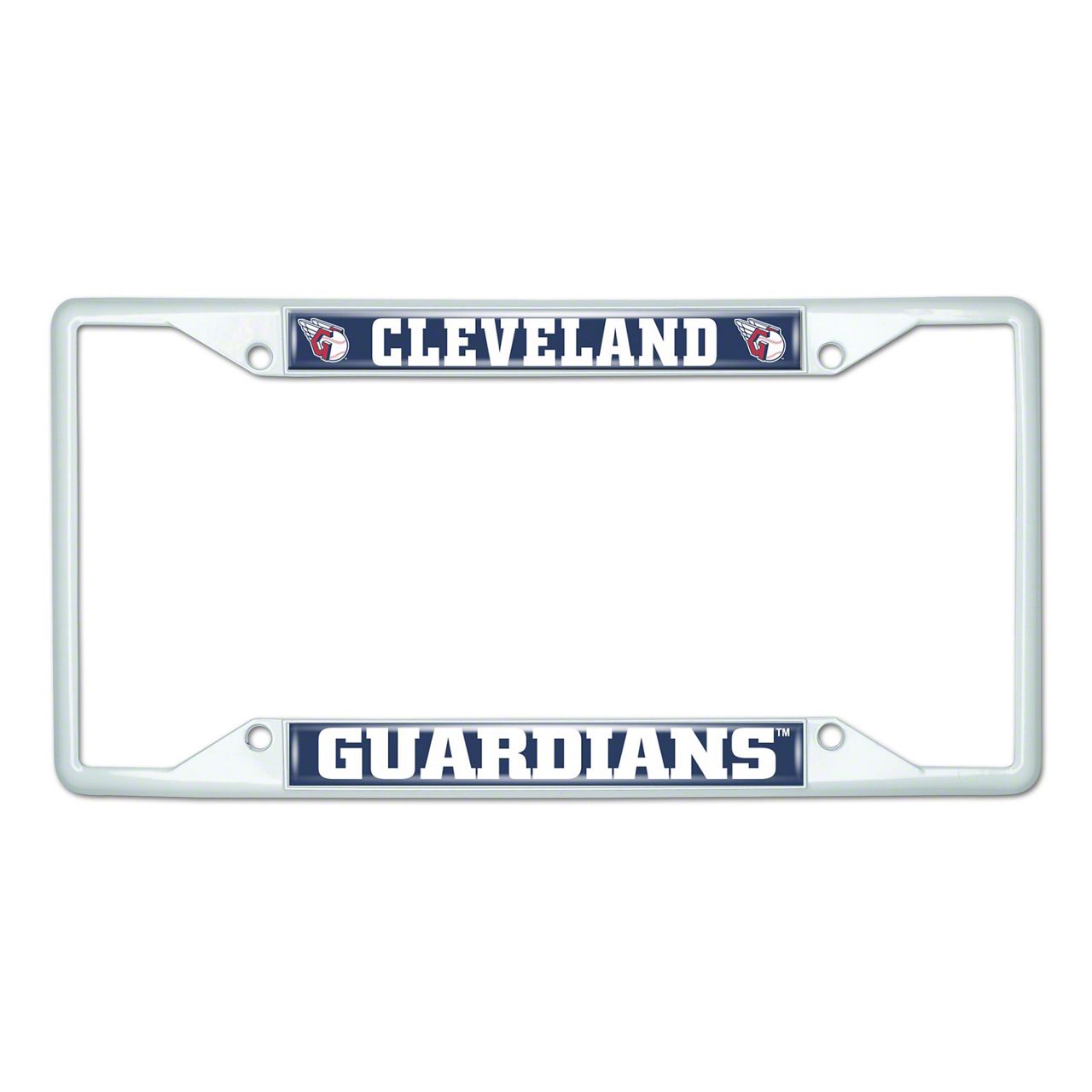 License Plate Frame with Cleveland Guardians; White (Universal; Some Adaptation May Be Required)