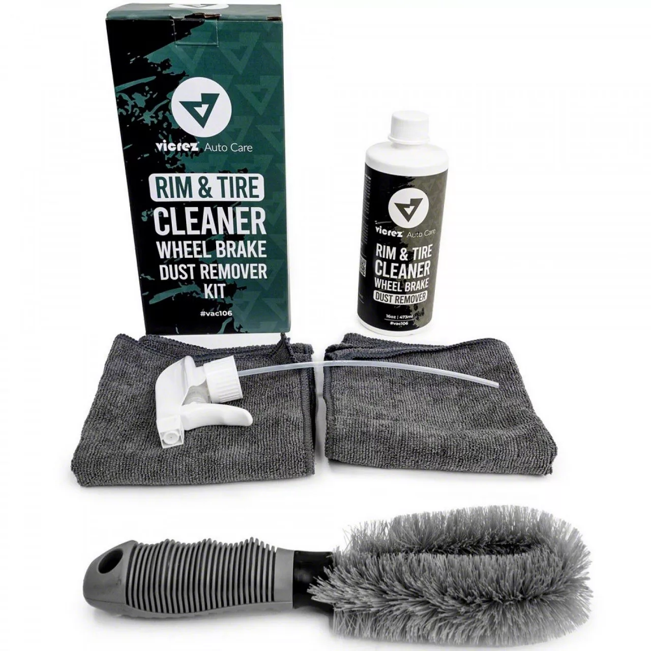 Introducing Vicrez Auto Care vac106 Rim and Tire Cleaner, the ultimate solution for removing brake dust and grime from your car's rims and tires. Our specially formulated Wheel Cleaner is designed to remove iron from painted and metal surfaces quickly and safely, making it excellent for vehicles with heavy brake dust displacement. Our clear fluid turns purple as it reacts and dissolves contaminants, allowing you to rinse it away with water. Safe on all wheel types and painted surfaces, it's easy to use and effective.Directions:1. Shake the bottle well before use and begin with a cool, dry surface.2. Spray the Wheel Cleaner liberally on the surfaces to be cleaned.3. Allow the product to bleed into a purple color for 5 minutes (maximum 10 minutes)./li>4. Hose off thoroughly with a high-pressure spray and towel dry.Note:In case of accidental ingestion, do not induce vomiting and seek immediate medical attention. If product gets into eyes, flush with water for 15 minutes and seek medical attention if irritation persists. If skin irritation occurs, wash affected area thoroughly with soap and water. Keep out of reach of children.