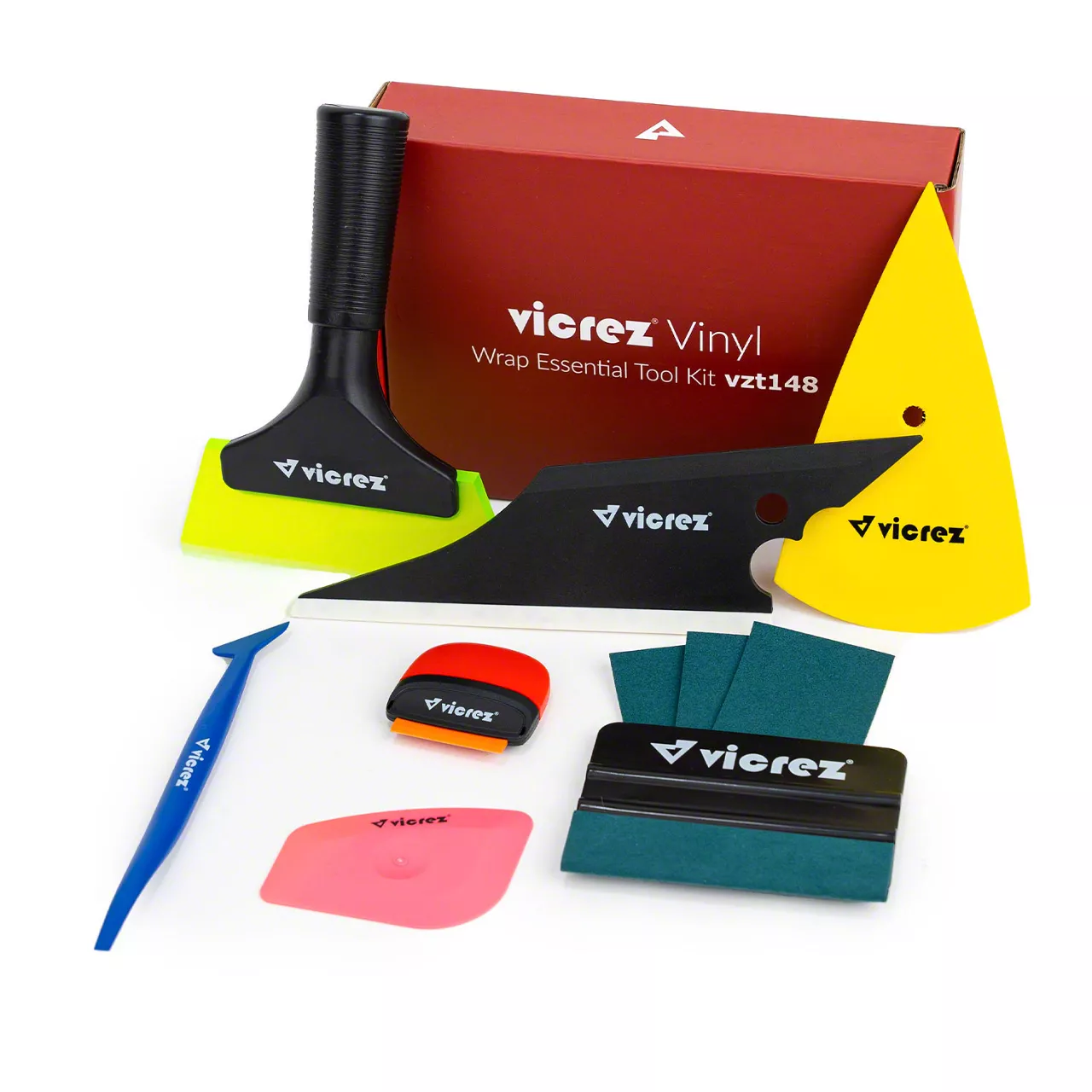 The Vicrez Vinyl Wrap Essential Tool Kit includes - Rubber Jelly Squeegee with Handle, Black Conqueror Squeegee, Felt Squeegee, Felt Replacements, Curve Slot Squeegee, Contour Squeegee, Mini Chisel/Scraper, Mini Scraper/Plastic Razor Blade