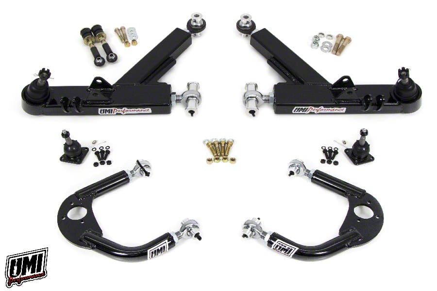 Performance Upgrade. The UMI Performance Front A-Arm Kit with Double Shear Shock Mount in black is designed to significantly enhance suspension durability and tuning flexibility for your vehicle. It provides a strong and adjustable setup ideal for autocross, road racing, and precise cornering, improving vehicle handling and stability.