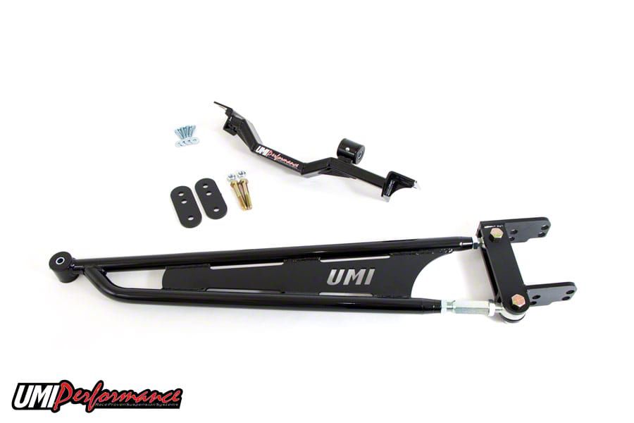 Track abuse, street abuse, or just flat-out abuse, this torque arm is designed to handle it all! Eliminate unwanted traction problems by adding a UMI Performance tunnel brace mounted torque arm. This aftermarket torque arm replaces the flimsy factory torque arm while adding strength, rigidity and eliminating suspension flex. UMI’s torque arm design relocates the front torque arm mounting point off the transmission tail shaft protecting the transmission and preventing transmission damage. A shorter torque arm improves weight transfer on acceleration. General Motors tail shaft mounted design works great for a stock driven vehicle however it was not designed to take the abuse of a drag car. UMI’s tunnel mounted torque arm bolts to existing floor pan holes using 3/16” thick mild steel laser cut mounting plates and metric grade 10.9 hardware. The torque arm attaches to the supplied cross brace using polyurethane bushings on both the supplied cross brace and torque arm to help absorb noise. The torque arm rear mount is 3/8” thick CNC machined mounting plates and are appropriately drilled to fit the stock rear ends as well as aftermarket 12-Bolt’s, 9” Rear-end housings and Strange S60.