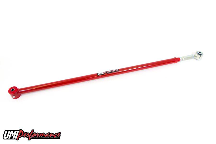 Performance Suspension Upgrade. The UMI Performance On-Car Adjustable Rear Panhard Bar; Roto-Joint; Red enhances the rear suspension of your Mustang by providing improved strength and precise rear-end adjustment. It is designed to reduce suspension bind while allowing for easy on-car adjustments, resulting in better handling and vehicle stability.