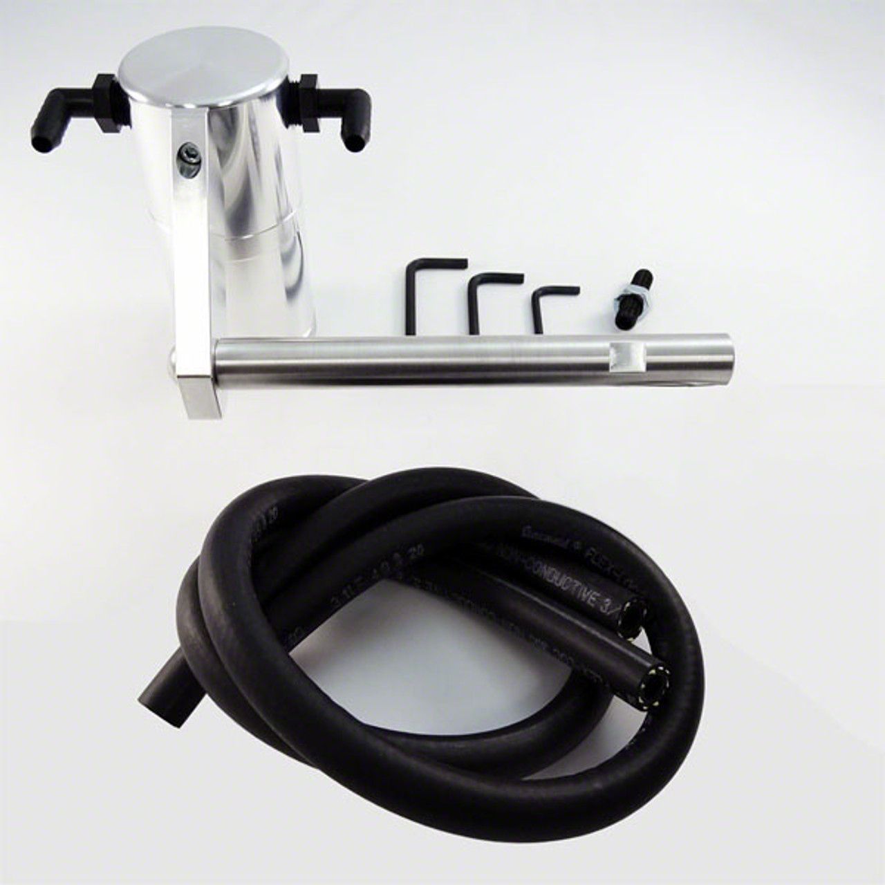 Construction and Appearance. Crafted from CNC machined billet 6061 T6 aluminum, this oil catch can is both lightweight and durable. It features a billet aluminum dipstick and sight glass, allowing for easy monitoring of the oil level and quality. The use of continental braided hoses and billet hose ends not only ensures reliability but also adds a high-performance aesthetic to the engine bay.