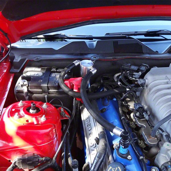 Durable and Stylish Design. Constructed from billet aluminum, this catch can is built for strength and durability. The black anodized finish adds corrosion resistance and a sleek, modern appearance, complementing your Mustang GT500's engine bay.