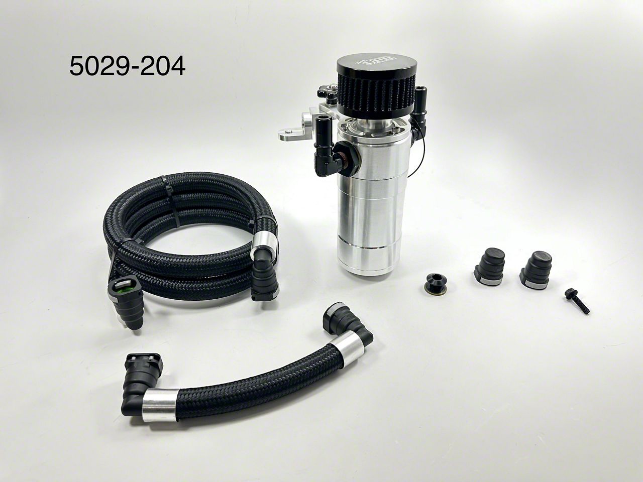 Construction and Appearance. This tank features a sleek satin black body paired with polished chrome accents for a bold under-hood look. CNC machined from billet aluminum, it offers superior strength and durability. The kit includes a braided hose and breather tank, both designed to handle the demands of high-performance setups, while maintaining a clean and integrated appearance on the passenger side of the engine bay.