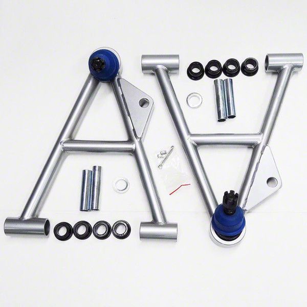 Advanced Suspension Enhancement. Upgrade your 1994-2004 Mustang's suspension with UPR Products Tubular Lower A-Arms. These A-arms are engineered for both street and strip use, providing a significant weight reduction of 16 pounds over stock components for enhanced performance. The complete kit includes precisely CNC machined arms crafted from 1-inch 0.095 wall chrome moly tubing and features a raw metal and dark blue finish for added durability and style.