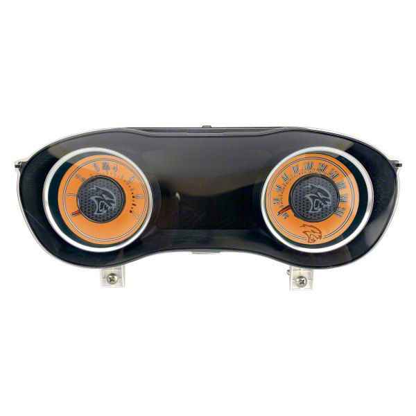 Exceptional Structure. The US Speedo Daytona Edition Gauge Face is designed with a Hellcat logo, giving it a unique and bold look. The orange face color adds a sporty and vibrant touch to your dashboard, complementing your vehicle's design. The gauge face also features a 200 MPH speedometer range, allowing you to keep track of your speed with precision. Not to mention, it is constructed with polycarbonate plastic, ensuring exceptional durability and resistance to wear and tear.