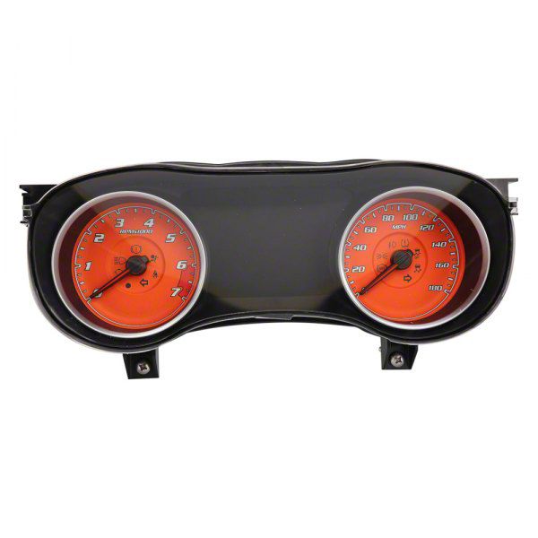 Vibrant Design. Change up your style and upgrade the interior of your Charger with this US Speedo Daytona Edition Gauge Face; 180 MPH; Orange. With an impressive range of up to 180 miles per hour, this gauge face allows you to monitor your Charger's performance with precision and accuracy. The eye-catching orange color of the Daytona Edition Gauge Face not only adds a touch of flair to your Charger's interior but also enhances readability, ensuring you can quickly and easily access crucial information while driving. Manufactured from high-quality materials, this gauge face is designed to withstand the test of time, maintaining its vibrant color and readability even under harsh driving conditions.