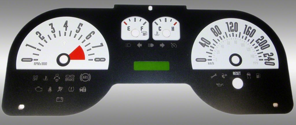 Application. This US Speedo Daytona Edition Gauge Face; KMH; 4-Gauges White fits 2005-2009 Mustang GTs.