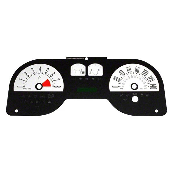 Screen Printed. The US Speedo Daytona Edition Gauge Face is the perfect way to upgrade the look of your 2005-2009 Ford Mustang GT's instrument cluster. The white Daytona Edition gauge face is constructed from polycarbonate plastic, which is both durable and long-lasting. The 4-gauges white screen printed design provides a sleek and stylish look, while still displaying the same data as your stock unit.