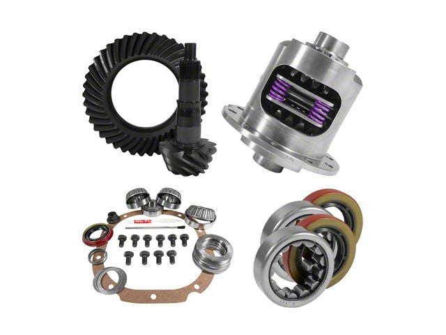 Construction and Appearance. The kit includes axle bearings and seals, as well as a Yukon Dura Grip clutch style limited slip, ensuring durability and reliability. The inner pinion bearing has a 3.25-inch outside diameter, and the ring and pinion gear set features a 3.27 gear ratio, all rigorously tested for quality and fit.