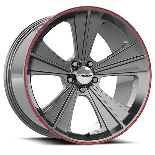 This Vision Wheel Missle Gunmetal with Red Lip Wheel; Rear Only; 20x11; 50mm Offset is completed in a high-quality blade cut finish that will be the envy of everyone. For added protection and looks, there is a clear coat that can withstand the rigors of daily driving.