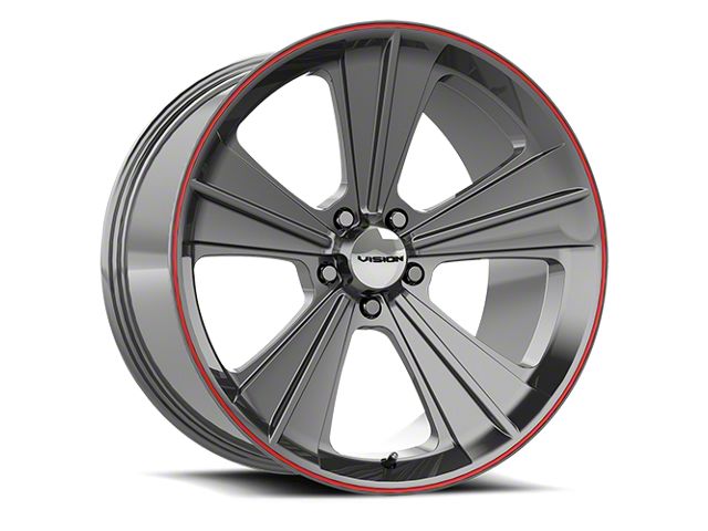 Vision Wheel Missle Gunmetal with Red Lip Wheel; Rear Only; 20x11; 50mm Offset delivers a bold and modern aesthetic, ideal for enthusiasts seeking a refined yet assertive look for their vehicle. With its standout design and distinct finish, this wheel enhances the vehicle's visual stance and street presence. The precise craftsmanship and premium aluminum build reflect Vision Wheel's dedication to quality and distinctive design. Whether parked or in motion, this wheel draws attention with its clean, aggressive styling.