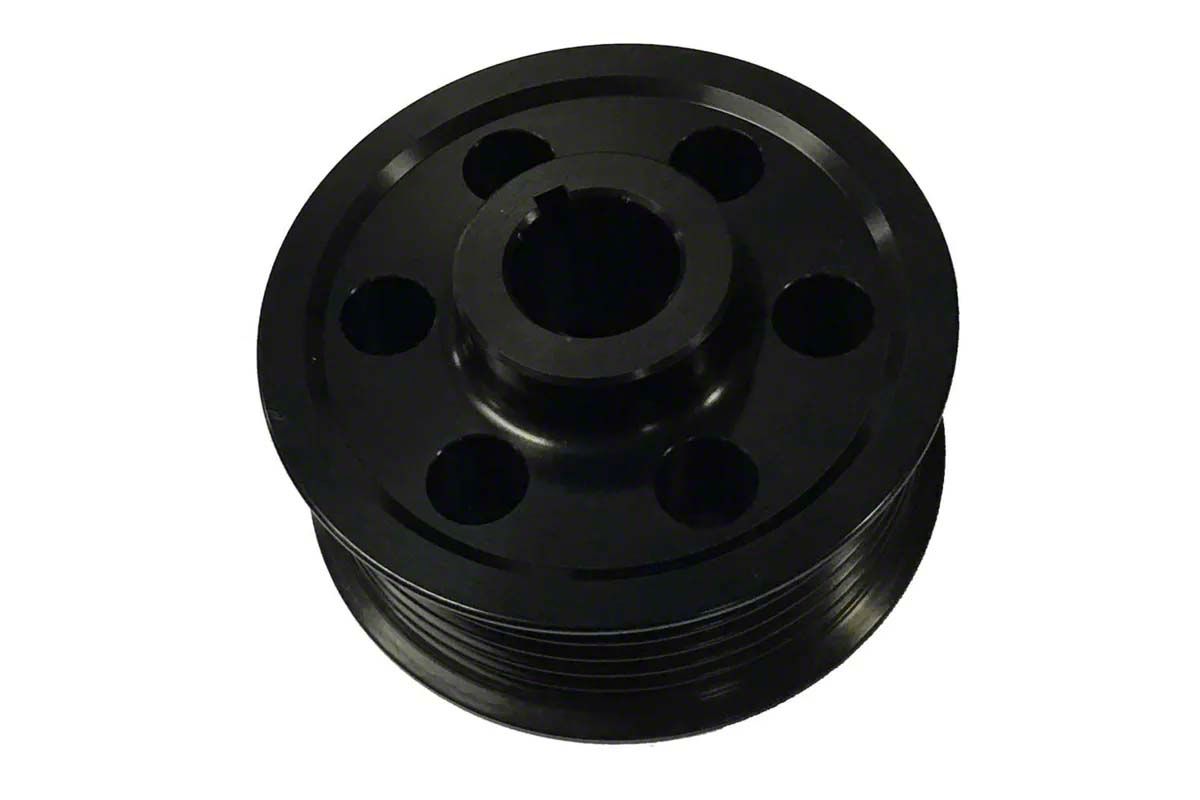 Construction and Appearance. Finished in a sleek glossy black coating, this pulley offers both durability and a performance-oriented look under the hood. Its smaller 2.49-inch design replaces the larger 2.57-inch stock pulley, improving blower efficiency and responsiveness. The robust construction ensures reliability under demanding conditions, making it a trusted choice for performance applications.