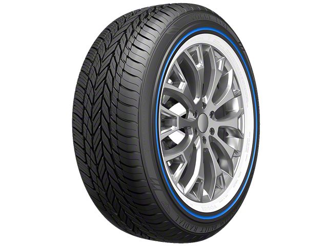 Stylish All-Season Tire. The Vogue Custom Built Radial Blue Stripe Tire offers a unique blend of style and dependable performance. With its distinctive matte black and white finish accented by a bold matte blue stripe, this tire stands out as much for its appearance as its functionality. Designed for year-round driving, it fits wheels requiring 215/70R15 sizing, serving as a direct replacement that elevates both looks and performance.