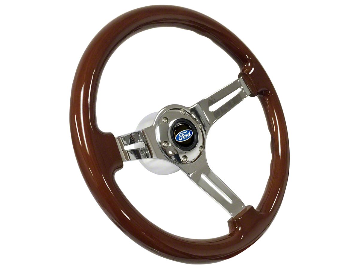 Construction and Appearance. The grip's mahogany wood finish provides a warm, luxurious feel, while the polished chrome center adds a sleek, modern contrast. The 70mm diameter chrome horn button and the unique Ford emblem integrate seamlessly into the design, affirming the wheel’s authenticity and high-quality craftsmanship. As an officially licensed Ford product, this steering wheel maintains the brand's heritage and appeal.