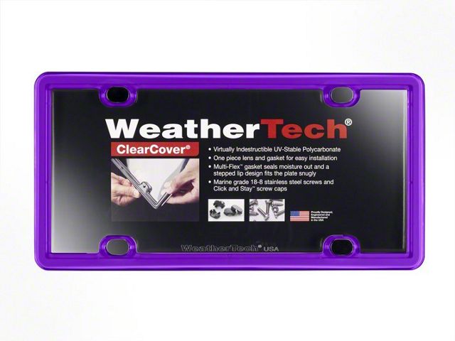 Durable, Striking, and Stylish License Plate Protection. The Weathertech ClearCover License Plate Frame is designed to provide a secure and stylish fit for your license plate, offering robust protection with a sleek look. Developed with a striking Purple color scheme, this frame enhances the appearance of your vehicle.