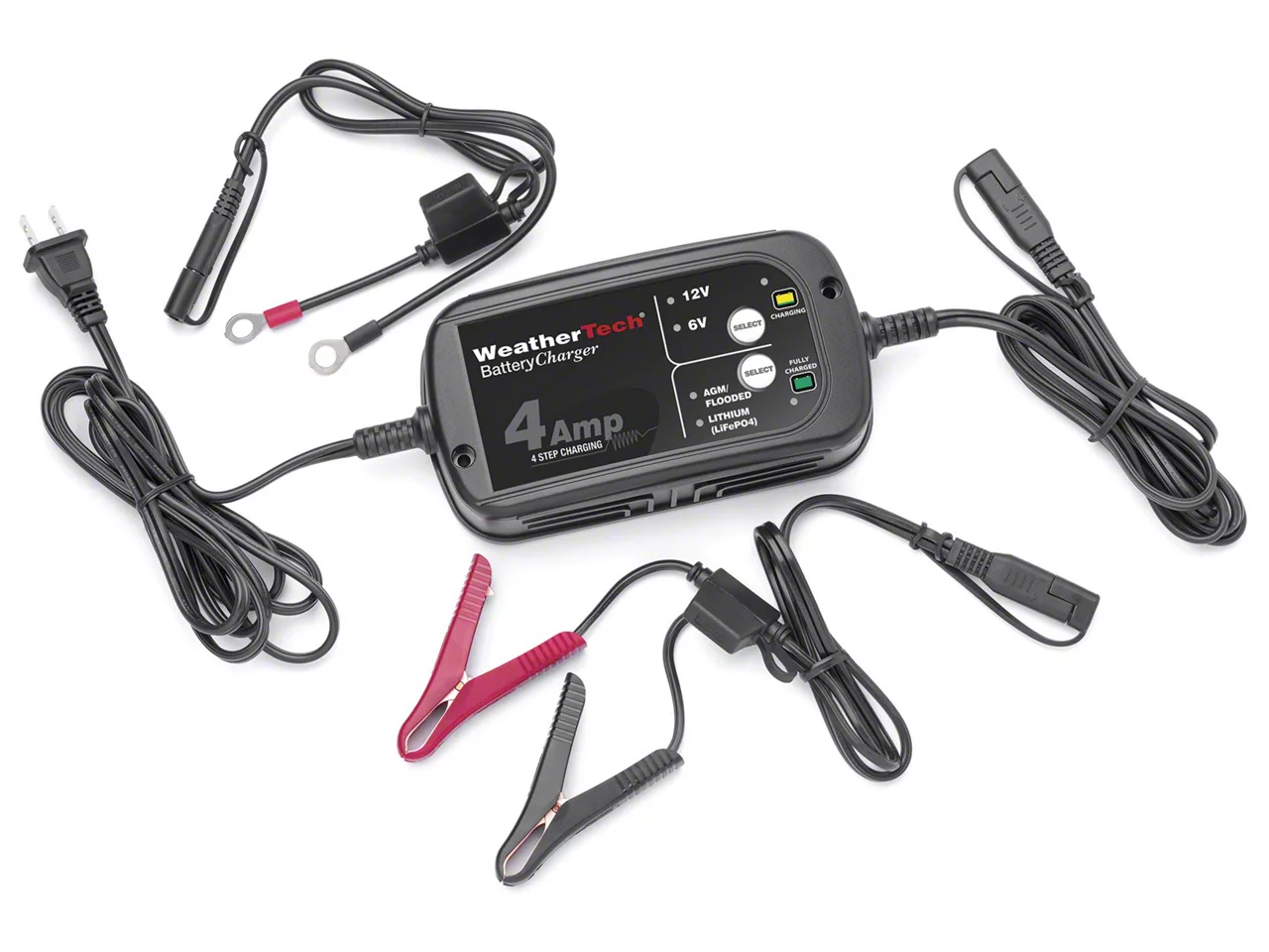Enhanced Battery Condition. Maintain and charge your vehicle’s battery with this Weathertech Battery Charger/Tender. This unit will automatically recharge your battery until it is full while holding a constant voltage after a full charge. This device works with AGM/standard and GEL/Lithium Iron Phosphate batteries and supports both 12 volts and 6 volts at 4 amperes. It also comes in a compact configuration, handy enough to easily tuck into your vehicle.