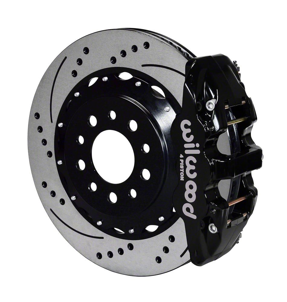 Upgrade Your Vehicle's Braking Performance. Transform your vehicle's braking capabilities with the Wilwood AERO4 Rear Big Brake Kit. This kit features 14.25-inch drilled and slotted rotors paired with sleek black calipers, providing enhanced stopping power and improved heat dissipation.