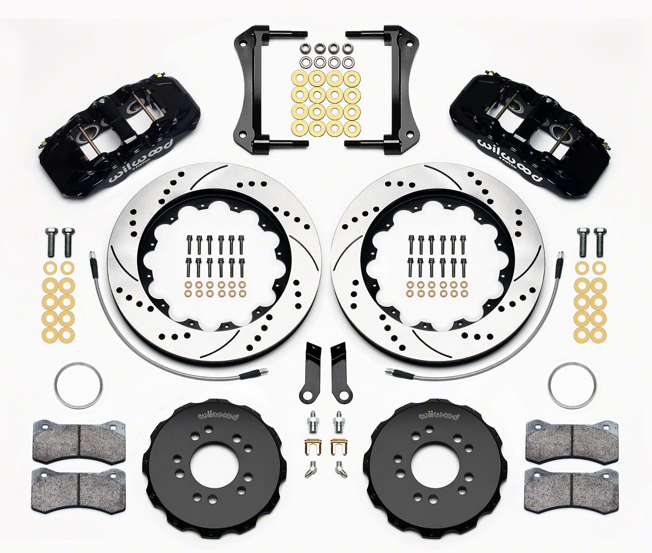 Application. This Wilwood AERO6 Front Big Brake Kit with Drilled and Slotted Rotors SRP Curved Vane Drilled and Slotted Brake Rotors is designed for use on the 2005–2014 Ford Mustang models equipped with a BMR suspension.