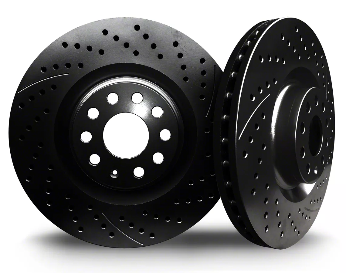 Construction and Appearance. This kit features G3000 cast iron rotors that are both cross-drilled and slotted for efficient heat dissipation and debris removal. The components are topped with a Black nano-coated finish that not only enhances resistance to corrosion but also gives a clean, premium appearance behind your wheels. The pads utilize high-grade Kevlar ceramic materials, engineered for reduced dust and smoother braking engagement.