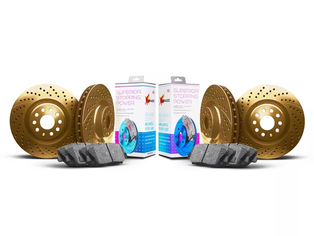 Construction and Appearance. This kit features G3000 cast iron rotors that are both cross-drilled and slotted for efficient heat dissipation and debris removal. The components are topped with a Gold nano-coated finish that not only enhances resistance to corrosion but also gives a clean, premium appearance behind your wheels. The pads utilize high-grade Kevlar ceramic materials, engineered for reduced dust and smoother braking engagement.