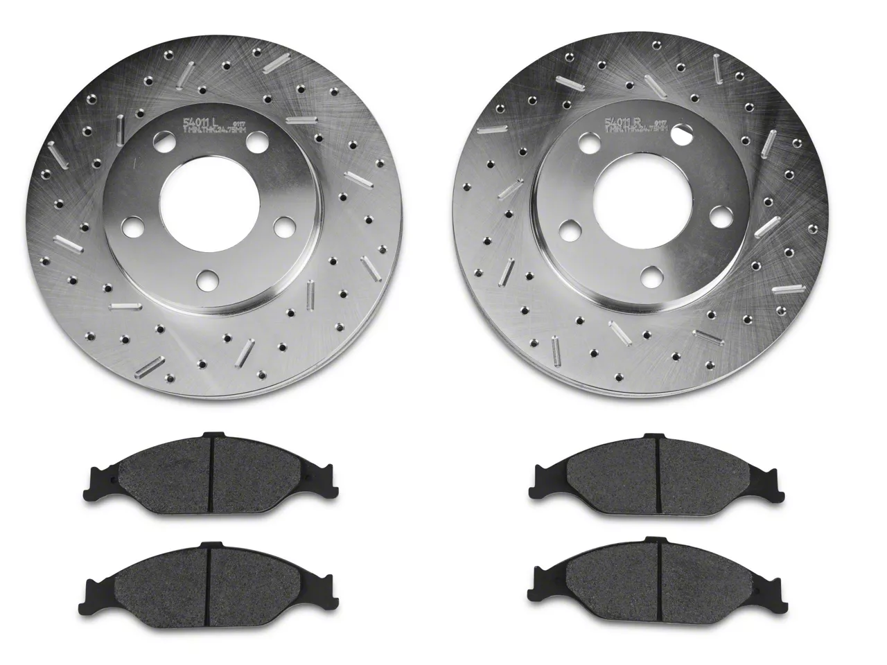 Quality Construction. Manufactured from a single piece of cast iron, these Xtreme Stop Precision Cross-Drilled and Slotted Front Rotors are extremely durable. The carbon graphic brake pads are manufactured from premium quality material that will last longer than the standard equipment front brake pads.